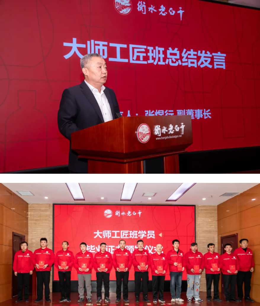2025年11月28日上午,酒都大厦15楼会议室内气氛庄重而热烈,河北衡水老白干酒业股份有限公司大师工匠班及衡水老白干大学管理系第四届学员毕业典礼暨第五届学员开学典礼盛大举行。本次典礼突破常规议程,在主持人张金光主任宣布仪式正式开启后,集团董事长王占刚率先登台,发表关于人才培养工作的指示,为典礼奠定基调,充分彰显公司对“人才强企”战略的高度重视。酒业公司高层领导、部分部门及车间负责人、授课老师代表与全体新老学员齐聚一堂,共同见证成长的荣光,共话企业的发展蓝图。