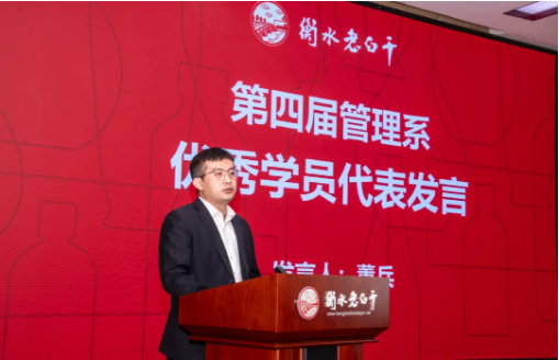 第五届管理系学员代表柴万林结合90 后、00 后特质,围绕识变、明责、笃行分享感悟,承诺珍惜学习机会、学以致用,愿与同窗携手,为衡水老白干的发展贡献力量。