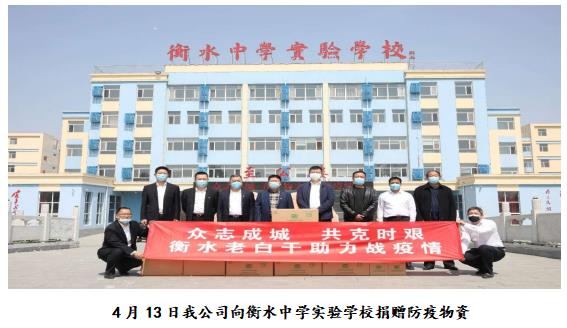 随着疫情防控趋于稳定,按照教育部门统一部署,全省学校毕业班师生开学在即。为助力我市学校师生安全顺利复学复课,4月13日至4月20日,酒业公司总经理王占刚、副总经理赵旭东、营销公司营销总监石新勇、衡水大区经理户传勇、公关部经理姜超等一行先后到我市衡水中学、衡水中学实验学校、衡水市第二中学,向学校无偿捐赠消毒酒、医用口罩等防疫物资,支援学校防疫工作,为师生后续返校复学复课营造健康安全的校园环境贡献力量。
