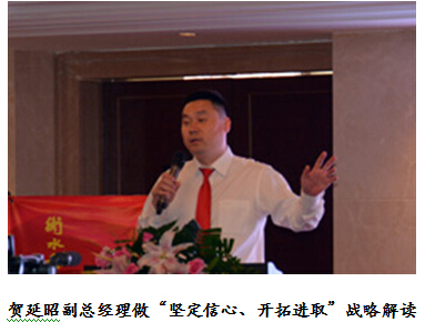 会议首先由衡水老白干营销有限公司贺延昭副总经理解读了衡水公司2016年《坚定信心、开拓进取》的主题战略规划,对于2015年衡水市场的发展情况做了充分剖析和总结,对衡水公司在2016年从产品、价格、渠道、促销、宣传、组织管理等方面市场发展策略指明了方向。同时从2016年的关键词“诚信、聚焦、拼命、创新、激励、纪律”等方面进行分享。